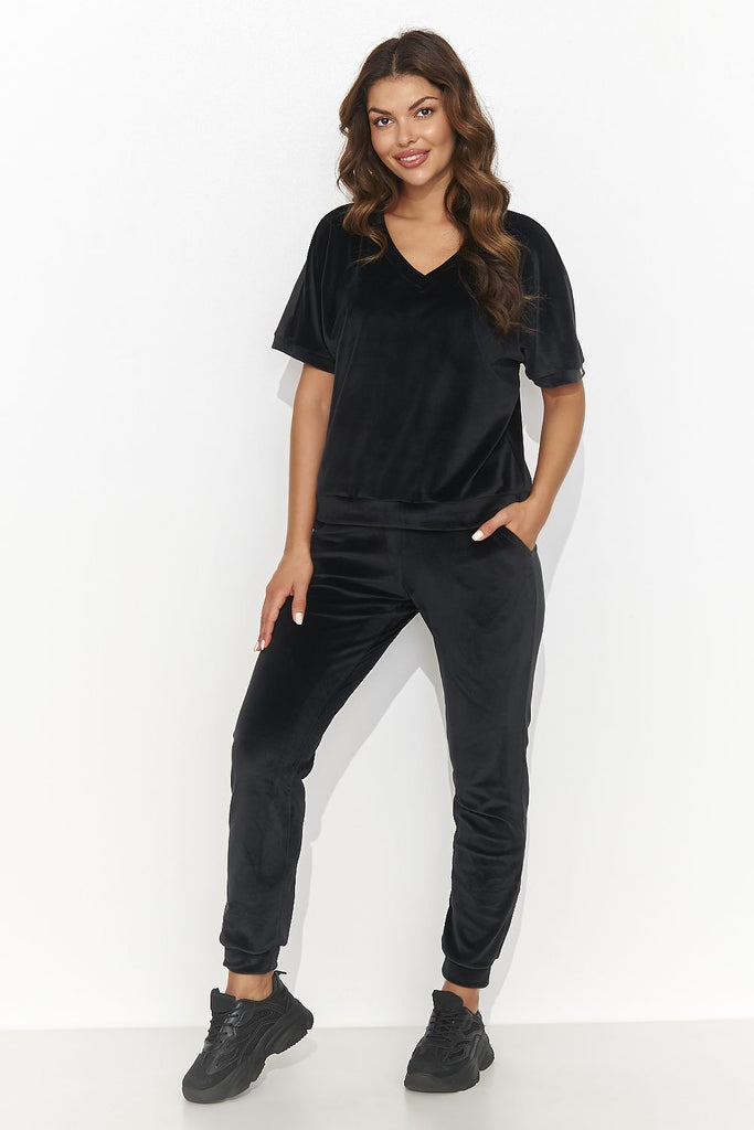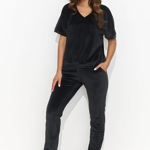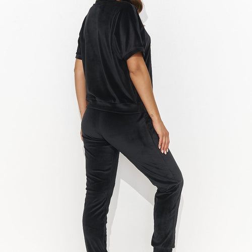 Lightweight women's velour tracksuit set is a combination of comfort and elegance. The set consists of a short-sleeved T-shirt with a v-neck, which adds lightness and subtlety to the whole styling. The long pants with a tapered jogger leg guarantee freedom of movement, while the practical slip pockets make it the perfect outfit for both relaxation and an active lifestyle....