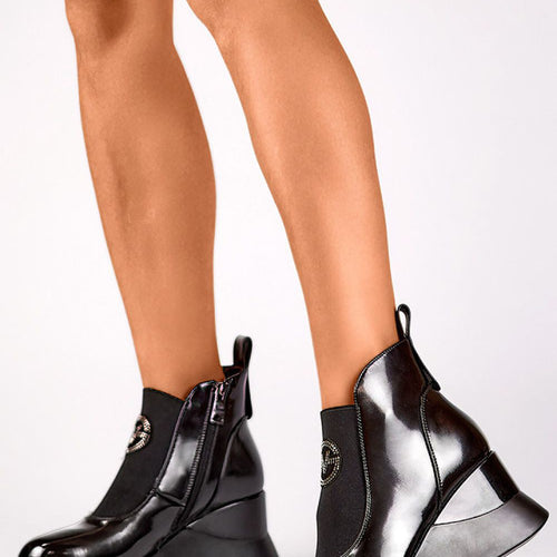 Women's boots made of natural leather. Set on an anchor and a platform. Fastened with a zipper on the side. On the upper an elastic insert and a small ornament. Rounded toes. The inside is insulated with shoe blanket. This model is an ideal choice for women who are looking for fashionable, yet comfortable shoes for every day! fabric natural...