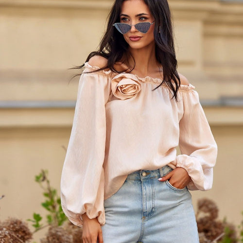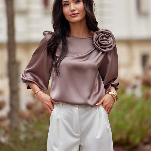 Model Giana is a blouse made of elegant, satin material. The round neckline of the blouse is adorned with a spectacular rose, which adds class and elegance and makes the blouse look extremely original. Wide, puffy sleeves that are 3/4 length beautifully emphasize the shoulders and feminine silhouette. Its loose cut provides freedom of movement and comfortable wear. Blouse Giana...