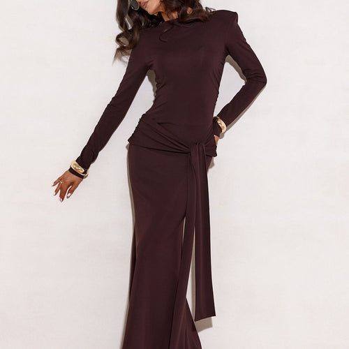 A long dress with long sleeves is a synonym of class and feminine charm in a modern version. Made of flexible material, it perfectly fits the silhouette, emphasizing its assets and providing full comfort. Shoulder pads give the outfit a clear shape and elegant character, while a decorative sash at the waist beautifully accentuates the waist. The deep neckline at...