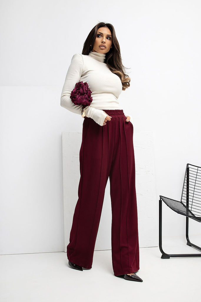 Modern and comfortable women's wide leg trousers, perfect for everyday and office styling. Made of a blend of viscose, elastane, and nylon, they are soft, flexible, and fit the silhouette perfectly, providing comfort throughout the day. The dominant smooth pattern makes the trousers versatile and easy to combine with various wardrobe elements. The model has a high waist, which accentuates...