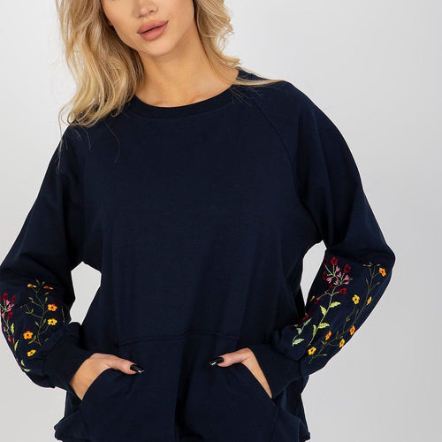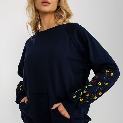 Women's sweatshirt with long sleeves and a kangaroo pocket. Decorative embroidery on the sleeves. Cotton 90 % Spandex 10 % Size Chest L/XL 91-96 cm S/M 82-86 cm