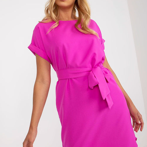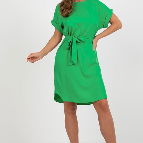 Dress with short sleeves and a round neckline. At the waist a belt for tying. Perfect for everyday wear. Spandex 5 % Polyester 65 % Viscose 30 % Size Chest Waist L 91 cm 84-90 cm M 86 cm 78-86 cm S 82 cm 72-80 cm XL 96 cm 88-96 cm