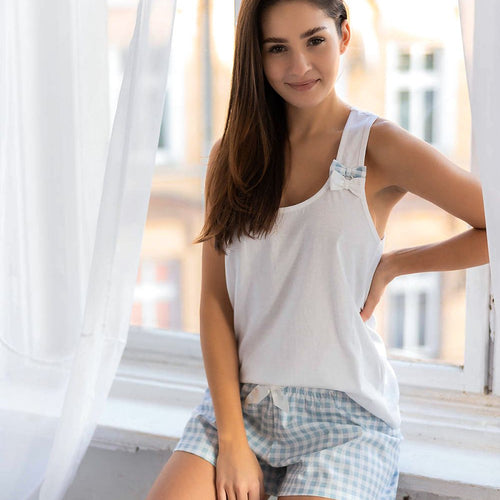 Ladies' white and blue cotton pajamas with sporty cut. Ideal during sleep, also works well as a homewear. The set includes a white blouse with wider straps, bows on the shoulder and simple, comfortable checkered shorts. A satin bow at the waist. Cotton 100 % Size Hips Chest L 99-102 cm 90-93 cm M 95-98 cm 86-89 cm S 90-94...