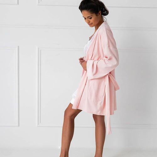 Women's bathrobe made of pleasant to the body material. Model with long sleeves. Envelope cut with a belt perfectly adapts to the silhouette. The bathrobe perfectly matches with a shirt or pajamas available in our nightwear collection. The bathrobe tied under the bust is ideal for pregnant women and nursing moms. polyamide 25 % Polyester 25 % Viscose 50 %...