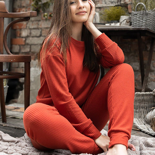 A two-piece set in the color orange. Made of ribbed, elastic fabric. It will be perfect both as a homewear and pajamas. A blouse of a slightly loose cut, pants with welt at the ankles. Spandex 5 % Polyester 62 % Viscose 33 % Size Hips Chest L/XL 99-106 cm 90-97 cm S/M 90-98 cm 82-89 cm