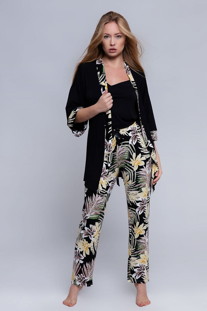 Black dressing gown made of soft viscose, decorated with patterned edging. The kimono style allows for a perfect fit into many different outfits. Sleeves up to elbows. Beautiful, exotic decorations in green and yellow color. Spandex 6 % Viscose 94 % Size Hips Chest L/XL 99-106 cm 90-97 cm S/M 90-98 cm 82-89 cm