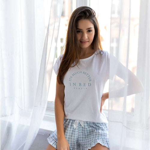Lovely two-piece women's pajamas in white and blue color. Cotton, soft, will ensure you a perfect rest while sleeping, it will also be perfect as a homewear. The set includes a white blouse with a print in the middle and checkered shorts with a bow at the waist. The thighs with a frill. Cotton 100 % Size Hips Chest L...