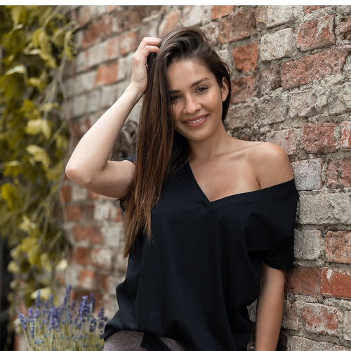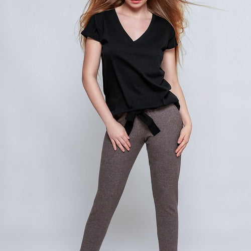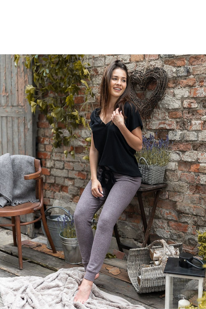 Impressive homewear and great pajamas from the new Sensis collection. Two-piece model, made of cotton and viscose knitwear. Top in the form of a versatile black t-shirt with V neckline. Trousers are smooth, coffee-colored, decorated with a stylish, decorative waist tie. Legs finished with welts. A great proposal for the new season and a perfect set with the Milee cardigan....