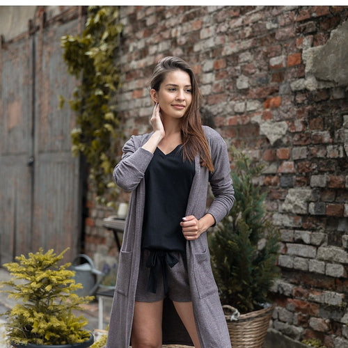 Impressive cardigan in a classic gray color made of viscose knitwear pleasant to the touch. Longer model, without a hood, with pockets on the sides, will make your homewear go to a higher level. Spandex 5 % Polyester 25 % Viscose 70 % Size Hips Chest L/XL 99-106 cm 90-97 cm S/M 90-98 cm 82-89 cm