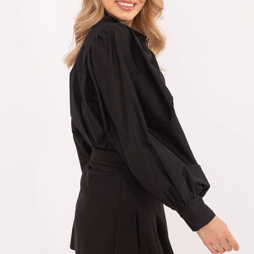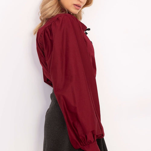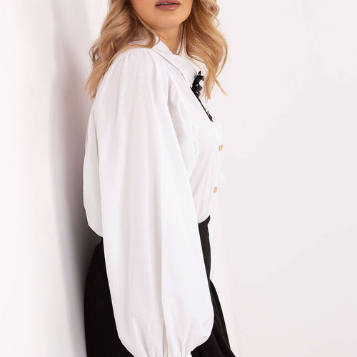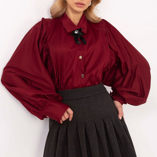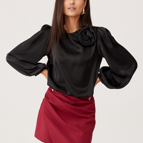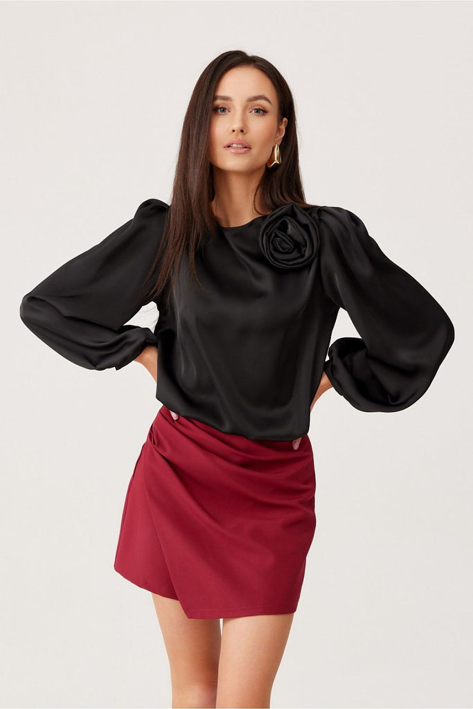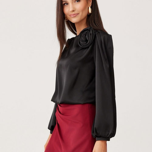 Evelyn blouse is a model created from satin material, which gives the styling an extremely elegant and luxurious look. The round neckline is decorated with a spectacular rose, which adds nonchalance and style, while making the blouse stand out with originality. The wide, puffy long sleeves beautifully expose the shoulders and feminine silhouette. Its loose fit guarantees freedom of movement...