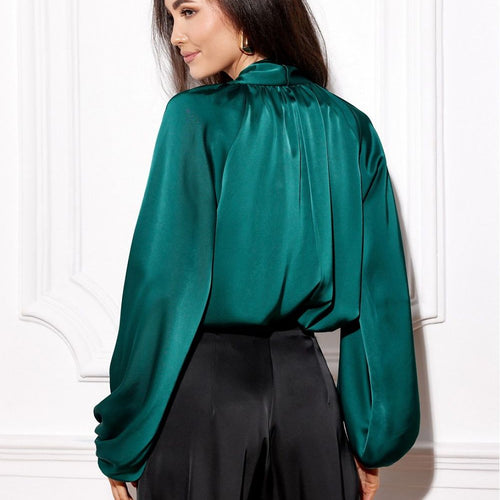 Satin blouse with long, puffy sleeves finished with elastic bands. It has decorative lacing at the neckline. Polyester 100 % Size Chest 36 88 cm 38 92 cm 40 96 cm