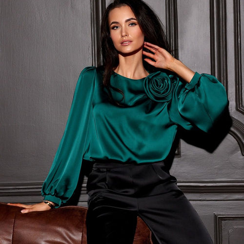 Blouse Evelyn is a model created from satin material, which gives the styling an extremely elegant and luxurious look. The round neckline is decorated with an impressive rose, which adds nonchalance and style, while making the blouse stand out with originality. Wide, puffy long sleeves beautifully expose the shoulders and feminine silhouette. Its loose fit guarantees freedom of movement and...