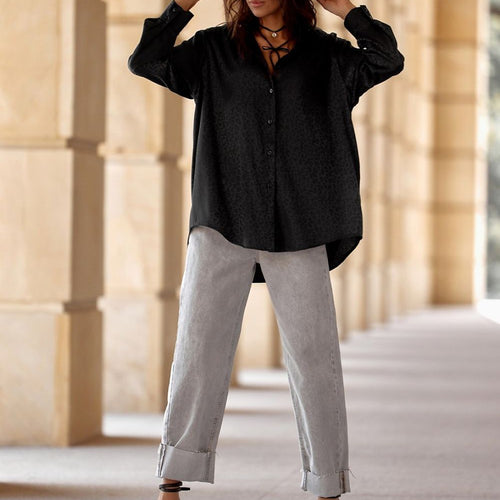 The shirt is made of delicately shiny fabric with an embossed leopard pattern, which is an interesting way of breaking the classic into its more extravagant version. The shirt's generous cut will perfectly fit any type of figure, hide any figure deficiencies and add a fashionable touch. The long, voluminous sleeves are finished with cuffs fastened with two decorative buttons....