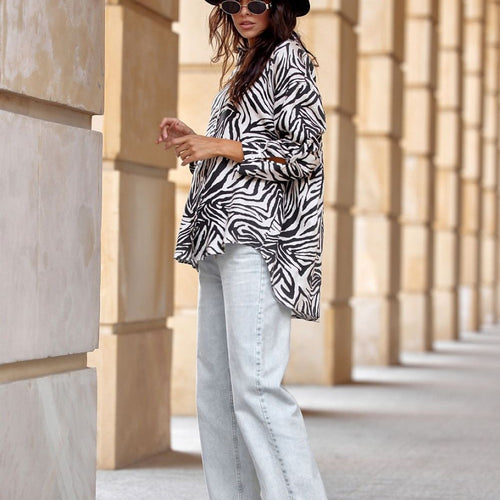 The shirt is made of pleasant material with animal patterns, which are an extremely fashionable accent for the upcoming autumn-winter season. The pleasant texture of the material is extremely comfortable against the skin and guarantees full comfort of use. The model with an extended back fits perfectly in a variety of styling with shorts, long pants and mini length skirts....