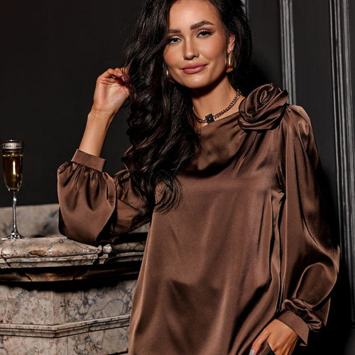 Evelyn blouse is a model created from satin fabric, which gives the styling an extremely elegant and luxurious look. The round neckline is decorated with a striking rose, which adds nonchalance and style, while making the blouse stand out for its originality. Wide, buffeted 3/4-length sleeves beautifully expose the shoulders and feminine silhouette. Its loose cut guarantees freedom of movement...