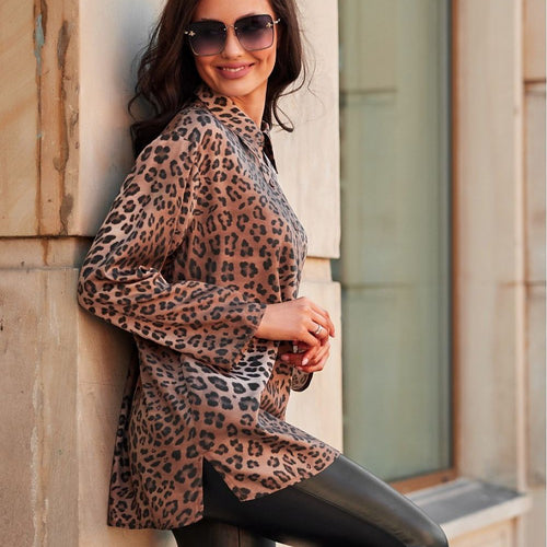 The shirt is made of a pleasant material in animal patterns, which are an exceptionally fashionable accent in the upcoming autumn-winter season. The pleasant texture of the material is extremely comfortable for the skin and guarantees full comfort of use. The model with an extended back perfectly complements various stylizations using shorts, long trousers, and mini skirts. A classic collar,...