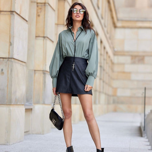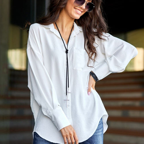 The asymmetrical shirt has a cute pocket on the front, is buttoned up, has a longer back, and a loose oversized cut. At the top of the model, there is a traditional collar that gives the whole look class and elegance. The looser fit will allow you to hide minor imperfections. An oversized shirt is a great choice for almost...
