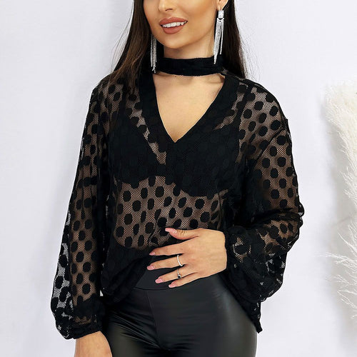 Elegant chiffon blouse. Made of beautiful chiffon with large dots. Extraordinary lightness is given to it by loose, buffet sleeves finished with an elastic band. The whole is broken by a slender neckline. At the neckline there is a striking tie, which can be worn in several ways: as a choker, with a knot or bow, or loosely. We guarantee...