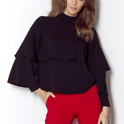 Ultra feminine blouse with ruffles, finished with a collar at the top. The sleeves and collar are decorated with silver buttons, which add to the blouse's elegance. Blouse made of airy and light fabric. Long sleeves, loose cut. A perfect idea to complete a feminine spring styling. Spandex 5 % Viscose 95 % Size Total length Chest 36 58 cm...