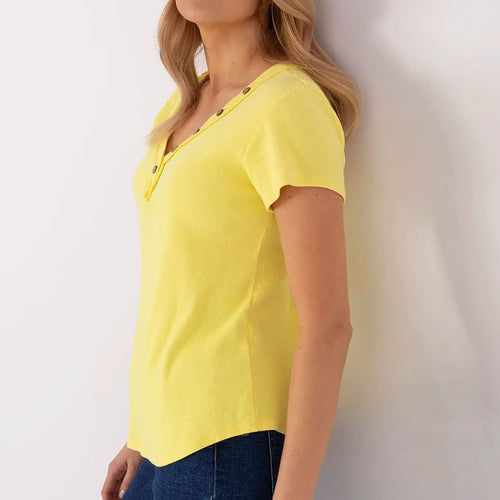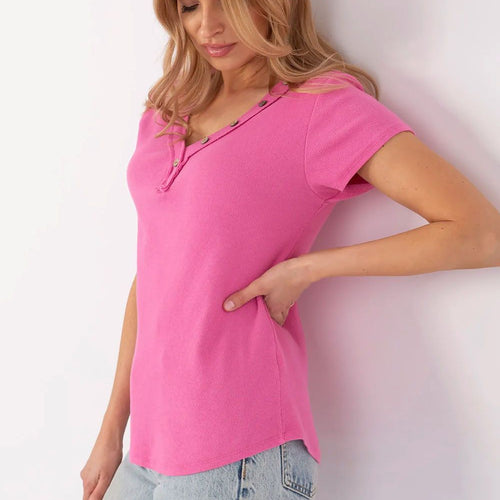 The fitted everyday blouse in a casual style, perfect for everyday wear and work. Made of high-quality cotton with added elastane, which ensures comfort and slight flexibility. The smooth material with a ribbed structure adds subtle texture, and decorative buttons are a stylish accent. The blouse has a standard length, short sleeves, and a feminine V-neckline that emphasizes the neck...