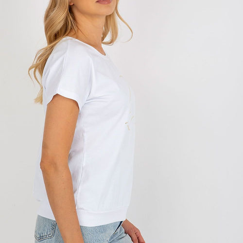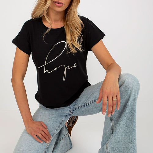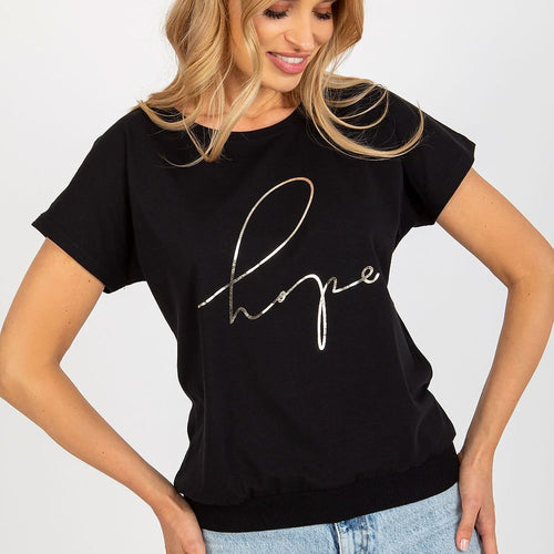 Straight cut blouse with short sleeves and round neckline. Decorative inscription on the front. Cotton 90 % Spandex 10 % Size Chest L/XL 91-96 cm S/M 82-86 cm