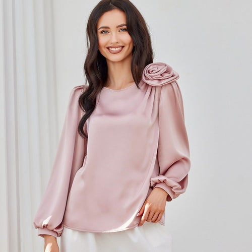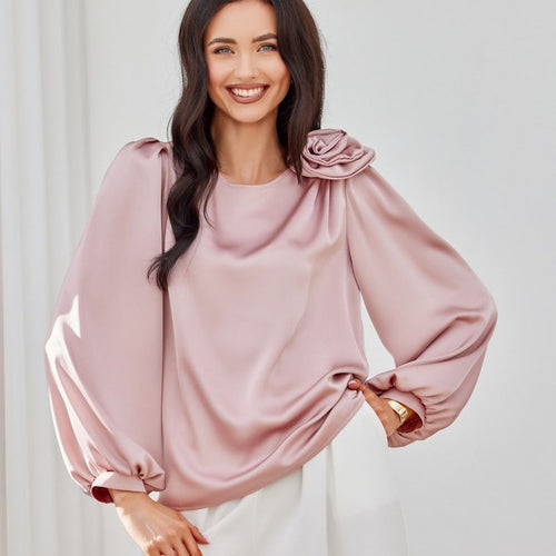 Evelyn blouse is a model created from satin material, which gives the styling an extremely elegant and luxurious look. The round neckline is decorated with a spectacular rose, which adds nonchalance and style, while making the blouse stand out with originality. Wide, puffy long sleeves beautifully expose the shoulders and feminine silhouette. Its loose fit guarantees freedom of movement and...