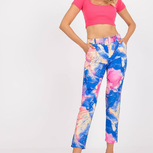 Women's pants with a straight cut made of colourful material. Zipper and button fastening, with slip pockets on the sides. A set with a belt in the same color scheme. Spandex 5 % Polyester 95 % Size Hips width Waist width L 102 cm 84-90 cm M 94 cm 78-86 cm S 90 cm 72-80 cm XL 106 cm 88-96...