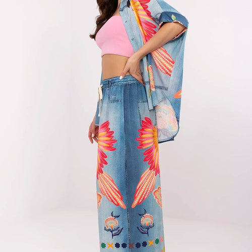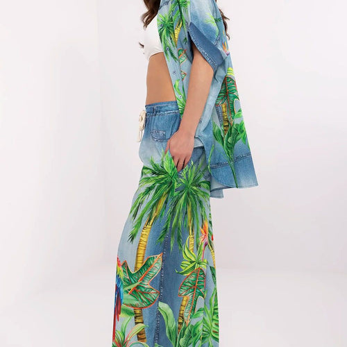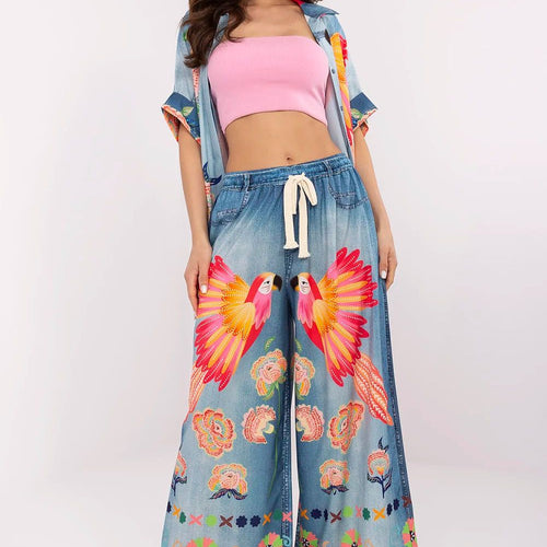 Stylish palazzo pants, perfect for everyday wear, made of lightweight material providing comfort and freedom of movement. These casual pants stand out with a colorful print that adds a unique character to them. Made of viscose with a touch of polyester, they are breathable and pleasant to the touch. They have a high waist that emphasizes the waist, and wide...