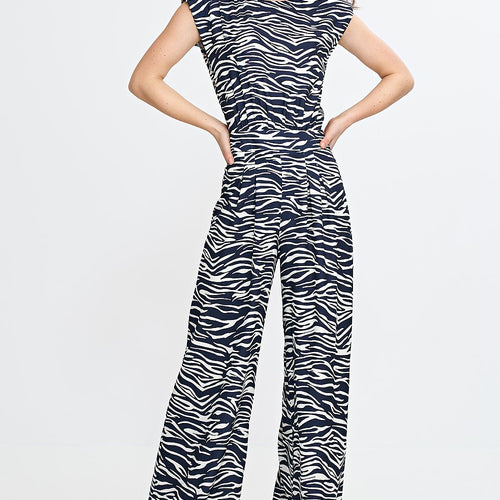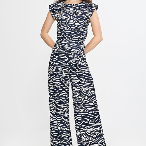 Stylish regular fit jumpsuit that combines classic with modern style. The boat neckline subtly highlights the neck line, while shoulder pads add sharpness and elegance to the silhouette. The fitted waist beautifully accentuates the figure, and wide palazzo-style trousers add lightness and casual chic. Practical zip fastening at the top and bottom at the back ensures comfort and perfect fit....