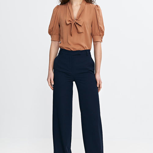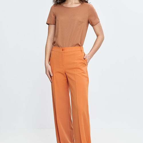 Elegant women's pants with a regular cut and medium waist, which combine comfort with classic style. The wide leg type adds lightness and a modern character to them. Pressed creases at the front and back give them an elegant look. The zipper and button closure provides comfort, and the classic front pockets are a practical addition. The pants have an...