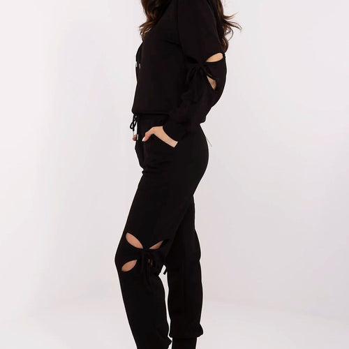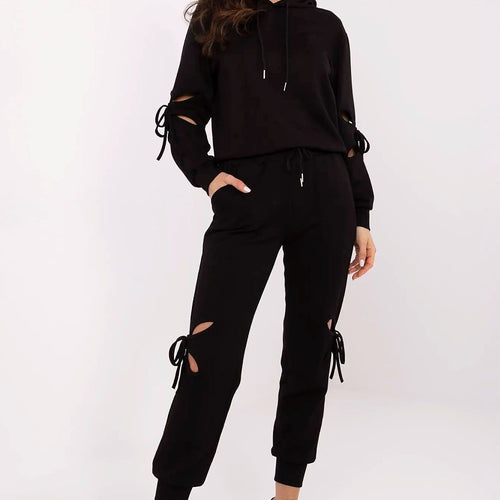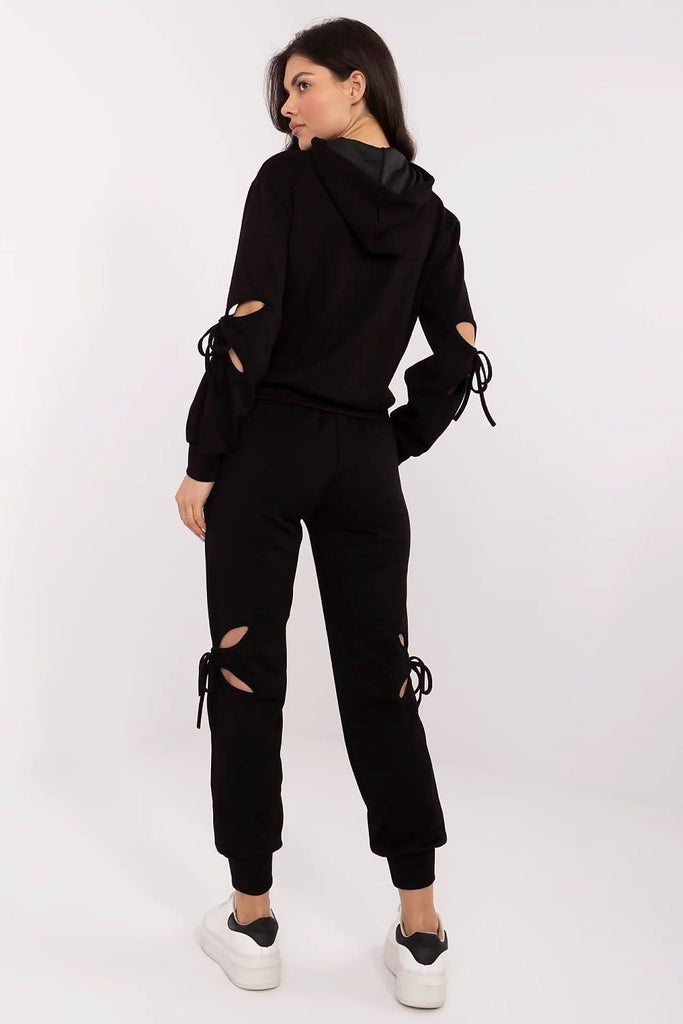 Casual tracksuit set is the perfect combination of comfort and fashionable style. Made of a soft blend of viscose, polyester, and elastane, it provides comfort and freedom of movement. The hoodie has long sleeves and subtle slits on the sleeves with decorative ties, which give the whole outfit an original character. High-waisted pants with slip side pockets guarantee comfort, and...