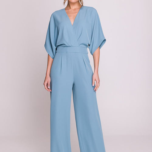 Stylish and elegant women's jumpsuit that combines comfort with a feminine cut. The top in a wrap style with subtle pleats beautifully drapes on the silhouette, and the V-neck adds lightness and emphasizes the neckline. Short sleeves provide comfort and freedom of movement. Slightly flared pants give the whole a harmonious proportion, and side pockets add a practical character. The...