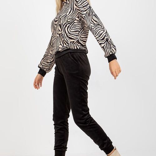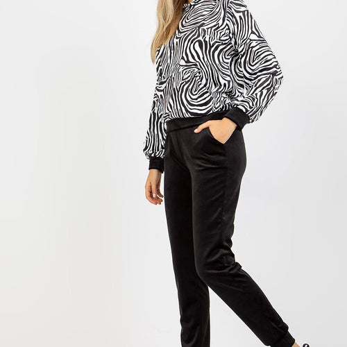 Ladies' velour set consisting of a blouse and pants. Long-sleeved blouse made of fabric in an interesting checkered pattern. Long black pants with slip pockets. Spandex 5 % Polyester 95 % Size Lenght Chest Waist S/M 60/97 cm 114 cm 68 cm