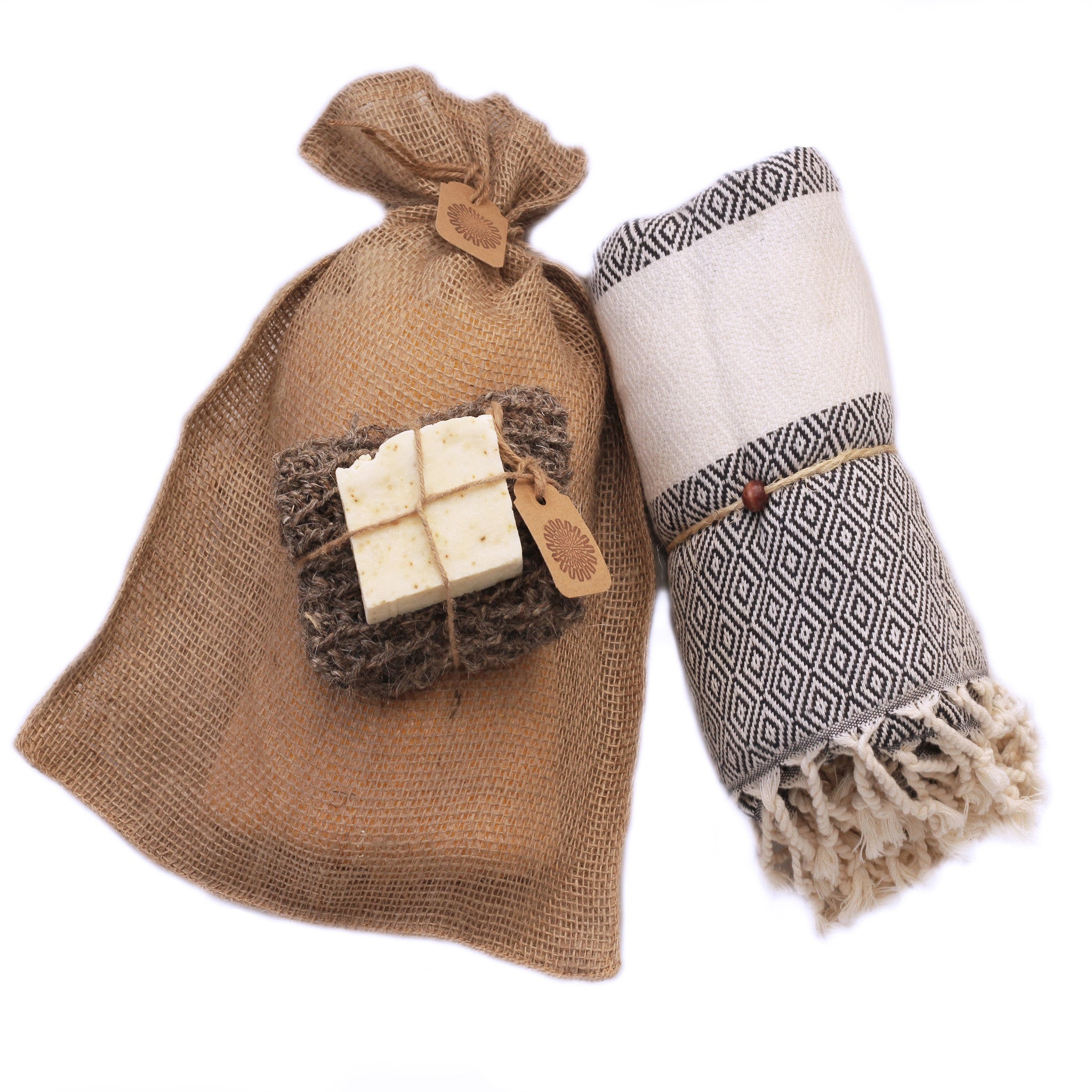 The set includes our Bath & Body collection makes a great gift for all celebrations. We have compiled nature's most nourishing and caring qualities and put them into a burlap bag. an artisan hammam towel, a moisturizing soap bar, and a unique hammam scrub glove. No need to worry about wrapping paper, because the set comes ready as a gift. It is wrapped in an Indian burlap bag and all items are individually tied together with a jute strap and wooden bead and have paper craft tags. Maybe this gift is for someone you love, maybe it’s for you.