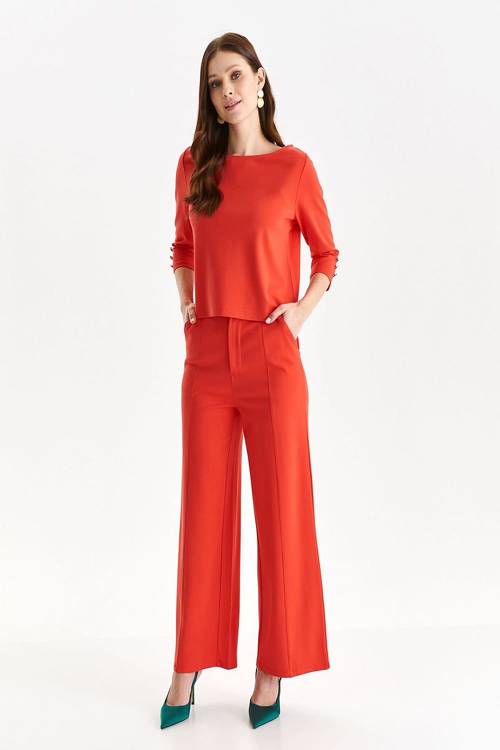 Short blouse with 3/4 sleeves and round neckline. On the sleeves decorative buttons. It will perfectly match with orange elegant pants.