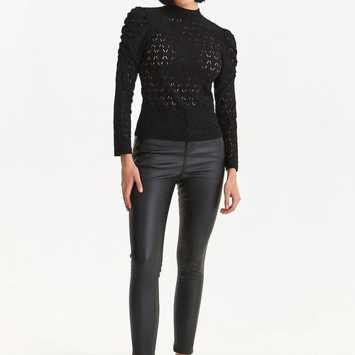 An extravagant women's blouse with a fitted cut, which accurately adheres to the female figure and exposes its slimness. It features buff straight sleeves and a delicate stand-up collar, which is buttoned at the back and enriched with an eye-catching teardrop-shaped slit. It is made of a pleasant-to-touch knit, being enriched with openwork patterns throughout. It goes nicely with classic...