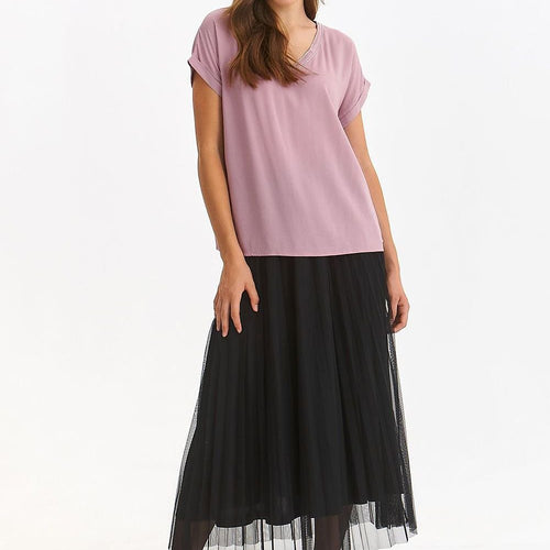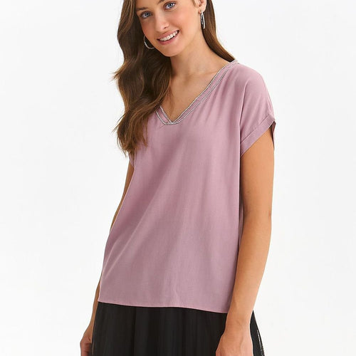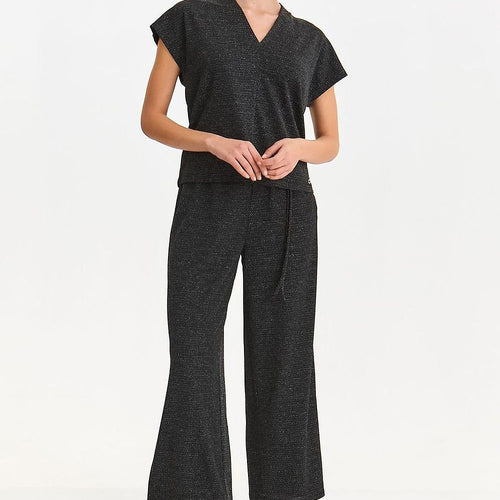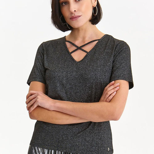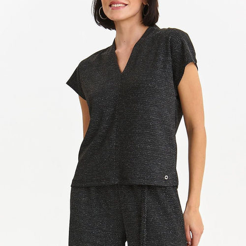 Valued for its unusual style and comfort during use, the women's blouse has a loose cut with short sleeves finished with delicate stitching. It has an eye-catching v-neck enriched with crossed thin stripes of the same material and was sewn from a soft and smooth knit with an addition of metalized thread, appreciated for its softness and smoothness. It looks...