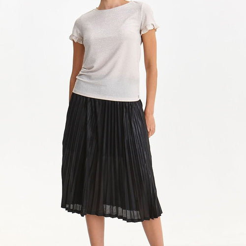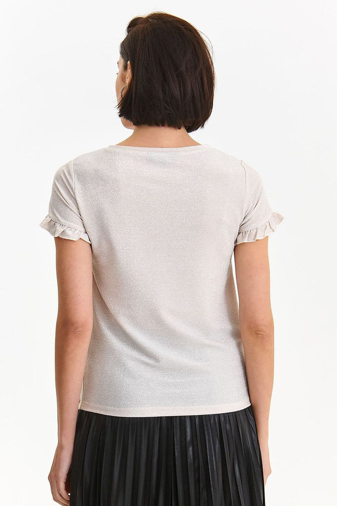 Fitted blouse, which adheres to the female figure and exposes its assets. It has short sleeves finished with a delicate, decorative frill and a round neckline with a small trim around it. It is made of pleasant to the touch and good quality knitwear with an addition of a metallic thread, impressing with its smoothness and delicate sheen. It looks...