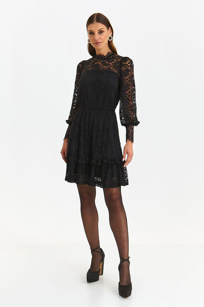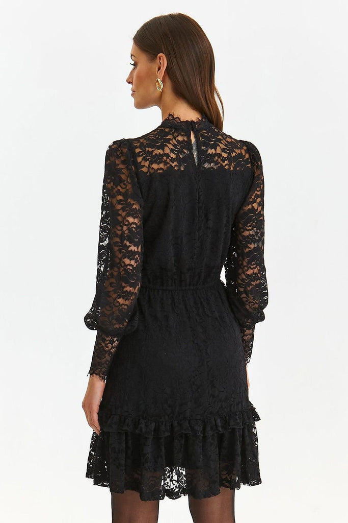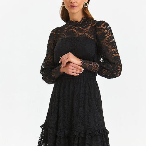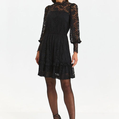 This is a delicate dress, perfect for special occasions. Made of lace, it has long sleeves and a romantic cut with a ruffle at the bottom. The lining provides comfort while highlighting the delicacy of the lace embellishments. The sleeves and yoke remain unlined, emphasizing the lightness and transparency of the lace pattern. Spandex 10 % polyamide 90 % Size...