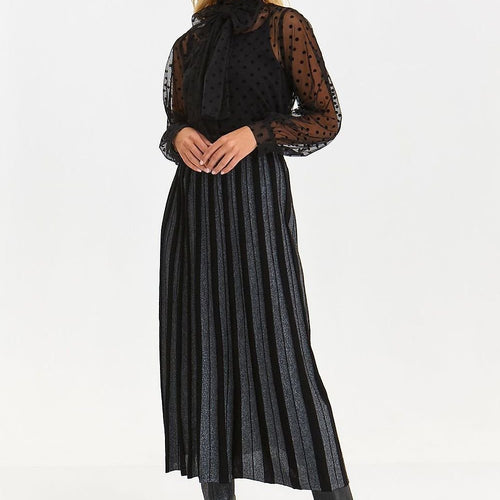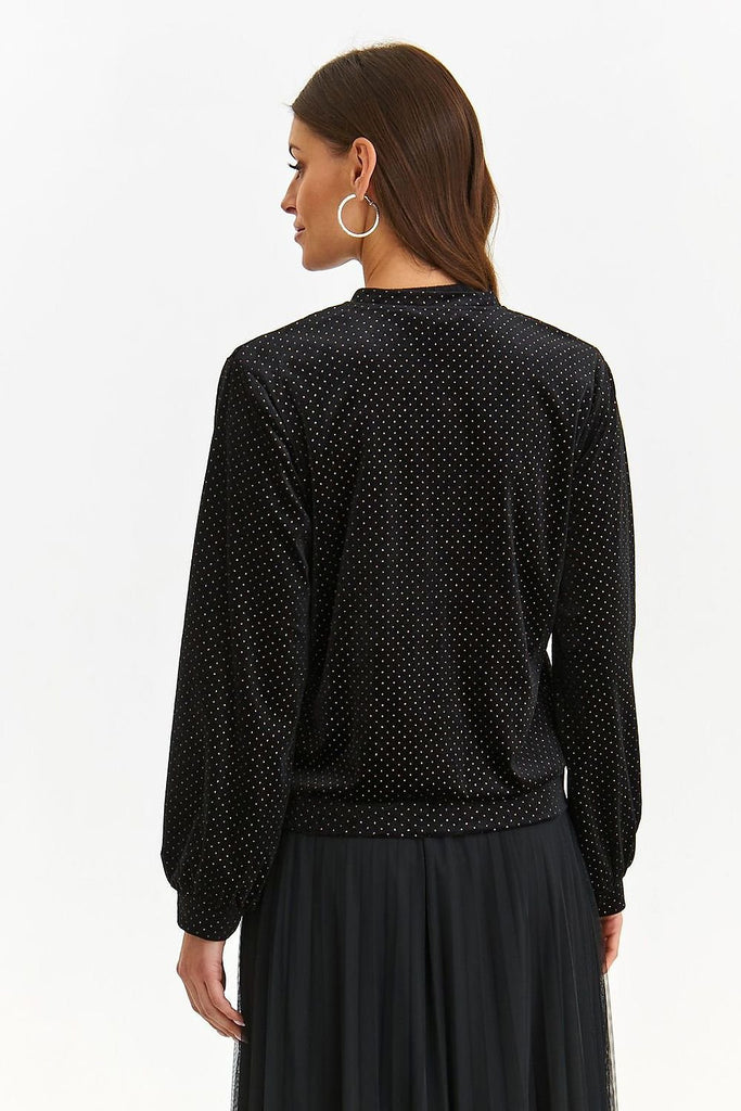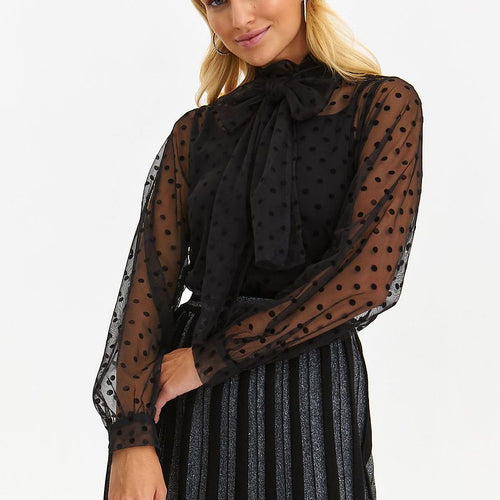 Elegant women's blouse in a loose fit with buff straight sleeves made of polka dot tulle. It has a striking collar on a stand-up collar with a magnificent binding at the front using the longer parts of the fabric and a button closure at the back. It is made of a delicate and pleasant to the touch knit, captivating with...