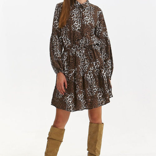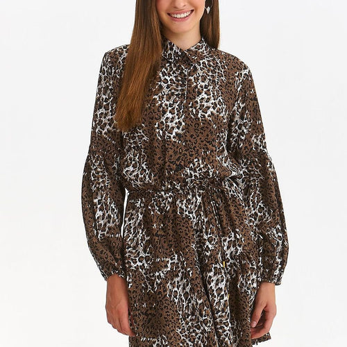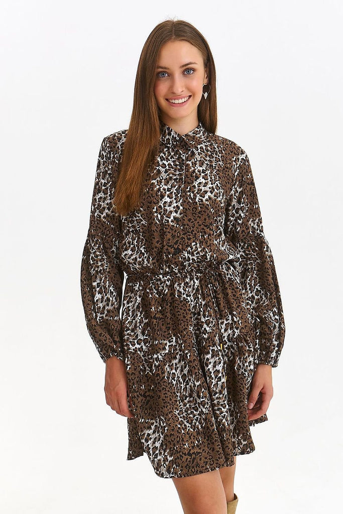 The women's dress has a loose fit with a simple long sleeve ending with an elastic band and a delicate collar at the top. It is buttoned from the waist line up, being enriched with a practical elastic waistband, emphasizing the slimness of a woman's figure. It was made from a delicate and pleasant-to-touch knitted fabric with a print of...