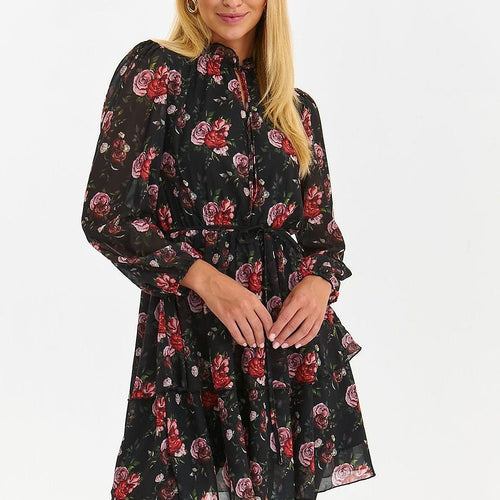 This romantic dress with long sleeves and a sweetheart neckline with an eye-catching tie looks extremely graceful. Subtle binding at the waist gives lightness to the silhouette, and a decorative ruffle at the bottom adds charm. Sleeves finished with an elastic band guarantee comfort and add character. The whole dress is made of fabric with colorful flowers, which adds freshness...