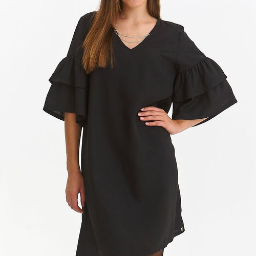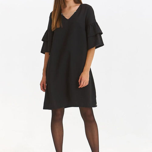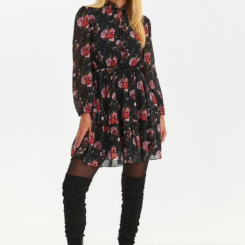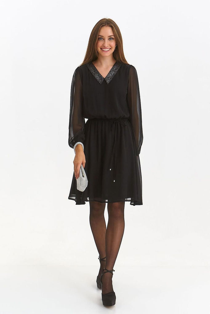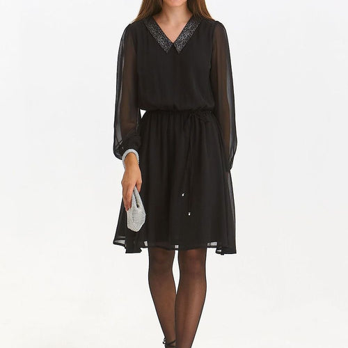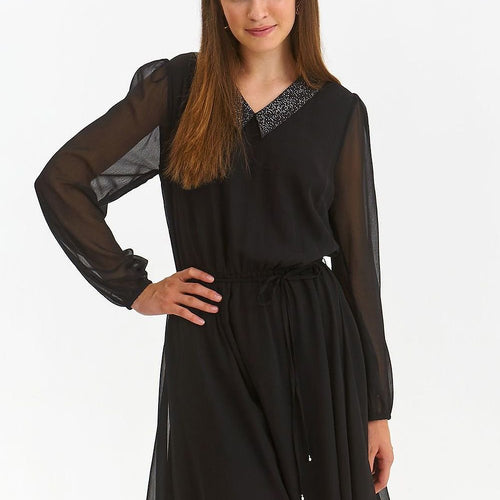 The black dress is an elegant choice for many occasions. Its length reaches before the knee, and long sleeves of transparent material add delicacy. It is finished with an elastic waist tie, which adds shape and style. The lining guarantees comfort, and the flared hem adds lightness. The collar gives it a classic, sophisticated look. Perfect for evening gatherings and...
