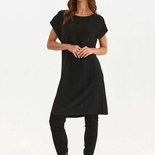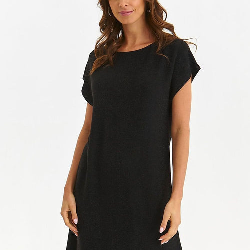 This is a dress with a slightly looser cut, with short sleeves and a round neckline for comfortable wear. Its fabric finished with a shiny thread adds a subtle sheen, giving it an elegant yet comfortable feel. Perfect for evening outings or special occasions, it adds subtle sparkle and expression to any styling. Spandex 5 % ~Przędza metaliczna 20 %...