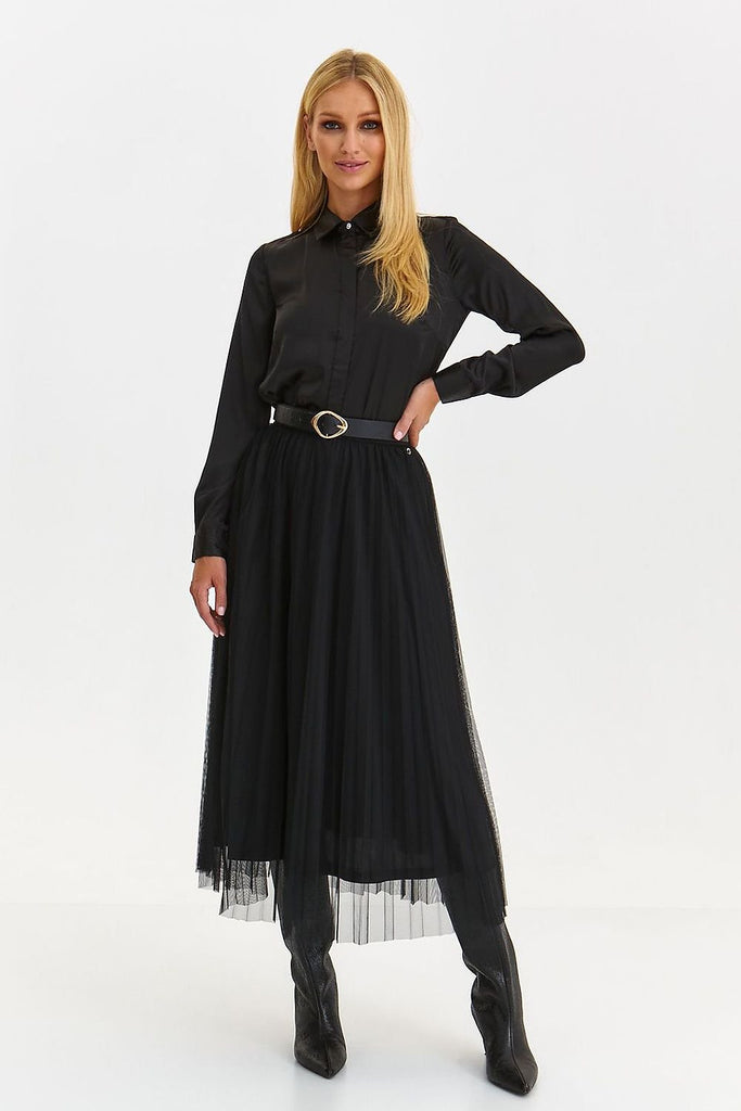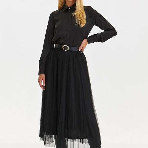 This black dress exudes elegance, but also remarkable minimalism in its cut. Its charm lies in the sophisticated details, such as the lace sleeves, which add some delicacy. The wide cuffs provide a subtle embellishment, while emphasizing the unique character of this dress. Its black color gives it versatility, allowing for casual combinations with accessories. It is an ideal choice...