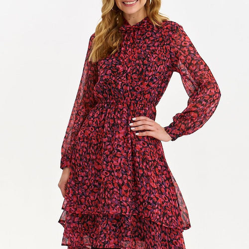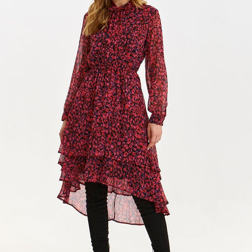 Full of elegance and class, this women's dress is of uneven length with a much longer back. It has straight sleeves ending in a cuff with a button closure and a collar with a wide ribbon tie. A practical elastic waistband and eye-catching ruffles at the bottom add to its charm. It is made of delicate and pleasant to the...