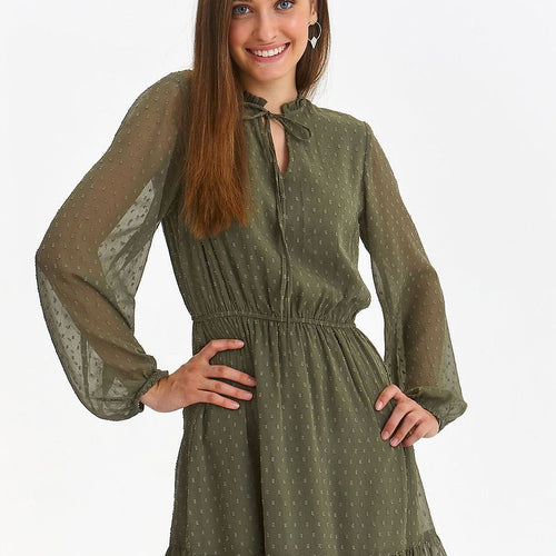 This dress is a combination of elegance and subtle charm. Its fitted cut emphasizes the silhouette, and a small collar adds a touch of class. Short sleeves with decorative buttons give the dress a unique character. A slit at the bottom, which allows you to move freely, also adds to the charm. This is an ideal choice for many occasions,...