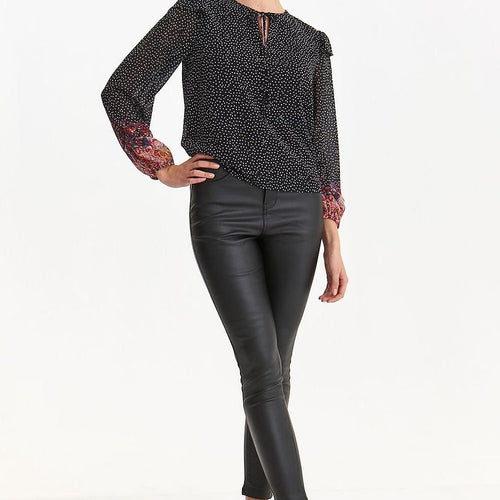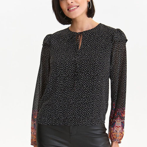 Extravagant women's blouse in a loose fit with long sleeves ending in an elastic band and full of fancy colorful print with oriental motifs. It has striking ruffles at the top of the sleeves, being tied at the front with a delicate ribbon. It is made of pleasant to the touch and delicate knitwear, enriched with a pattern of delicate...