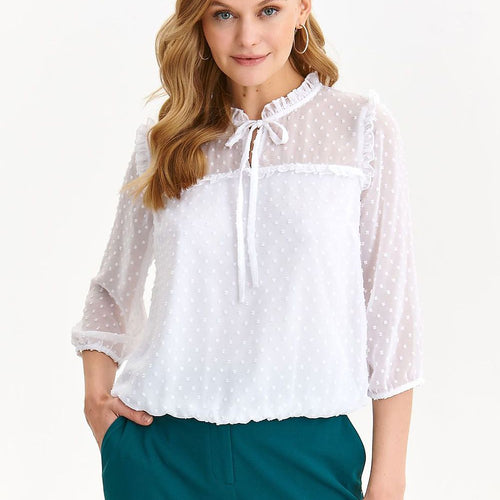 This women's blouse has a simple loose cut with 3/4 length sleeves ending in a loose elastic band. It has an eye-catching collar on a ruffled stand-up collar and an additional tie at the front with a thin ribbon, and charms with the inclusion of delicate ruffles at the front above the bust, as well as at the top of...